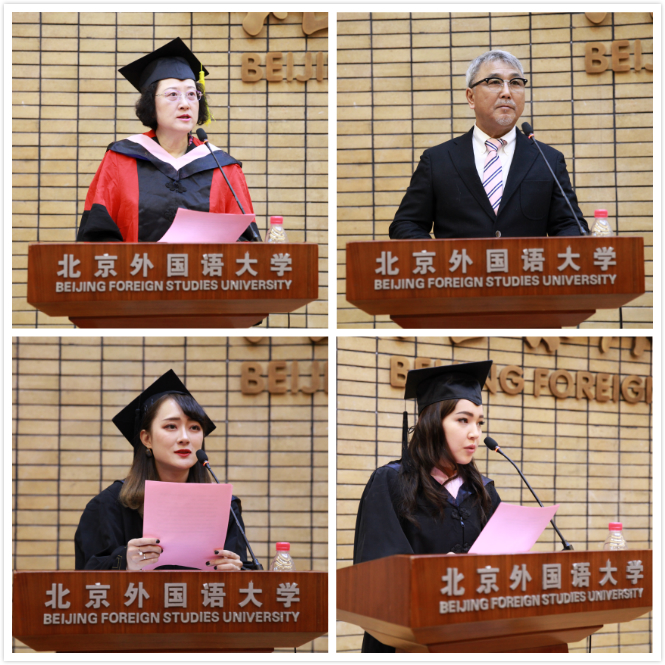 中文学院执行院长张晓慧老师致辞,对同学们顺利毕业表示祝贺,对同学们的未来生活表达了祝福。武田哲一先生发表了热情洋溢的讲话。毕业生代表下村祐实(日本)、柯林娜(俄罗斯)代表毕业生对学院的培养表达了感谢之情。