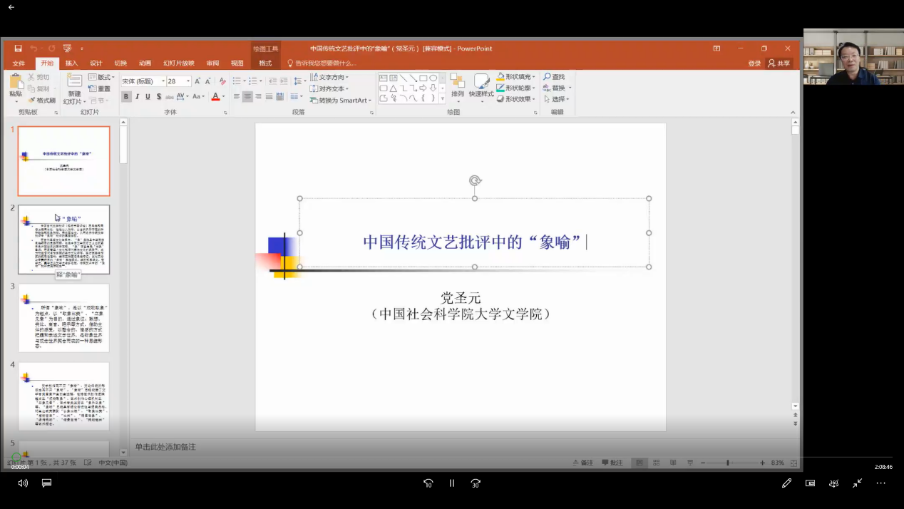 党圣元教授结合自己多年来对中国文艺批评的研究和认识,围绕“象喻”展开此次讲座。党先生首先详细介绍了“象喻”的概念,认为“象喻”是中国传统思维的固有品格。“象喻”以“观物取象”为起点,以“取象比类”“立象见意”为目的,是物象世界与观念世界契合而成的思维形态。接着党先生从具体的画论、书论和诗文理论入手,深入浅出地分析了中国传统文艺理论以自然之物、人和人体论文论艺的特点,并由象喻延伸到对文体学“体制”“语体”“体式”“体性”的思考,全面深刻地展现了“象喻”思维在各领域的辐射,及其在文学创作、文学批评和艺术审美层面的普适性与逻辑品格。最后交流环节,中文学院韩振华教授和张洪波教授分别就“象喻”思维的跨文化比较和“象喻”思维到“意象”与“意境”的关系提问,党圣元教授对此勾连中外古今的名家名篇给予了精彩的回应。