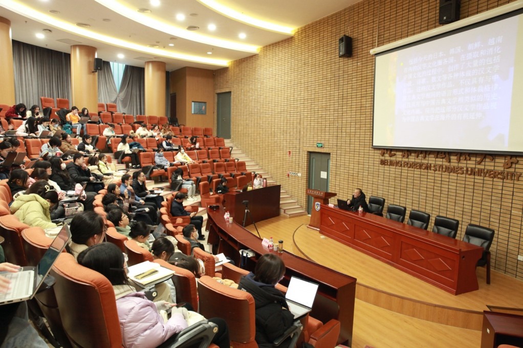 2023年12月13日下午,bv伟德国际1946bv伟德国际1946举办“北外文华讲堂”系列讲座,邀请国家级教学名师、国家万人计划教学名师、中国韵文学会会长、中国宋代文学学会副会长、浙江省特级专家、浙江工业大学人文学院肖瑞峰教授作题为《白居易与日本汉诗——经典传播与接受的一个案例》的学术报告。讲座由中文学院院长詹福瑞教授主持,副院长方稚松教授及师生数十人参加此次讲座。
