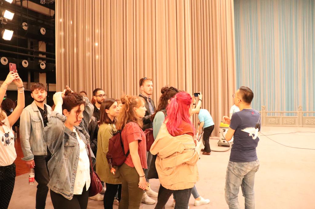 5月19日在bv伟德国际1946中文学院对外汉语系就读的22名意大利罗马大学留学生在夏菁老师的带领下来到人民剧场,观看了中国国家京剧院名家京剧《红桃山》的录制。