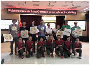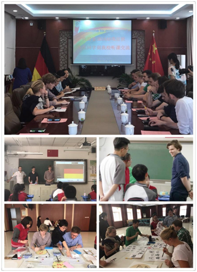 活动于下午一点半正式开始,简短的欢迎仪式后,9名德国学员首先深入到高一的两个班级旁听了一节英语课。之后,德国学员分别向高一1、2、3班的学生进行了30分钟的英语授课。在德国学员为北外附中的高中生们讲授英语课时,学生们都积极参与并踊跃回答问题。在游戏环节,课堂气氛一度达到高潮。短暂休息后,德国学员与北外附中的英语老师进行了座谈。德国学员提出“外语课的设置情况、教师的选拔与培养、高考、学生管理”等问题,并得到了老师们的积极解答。同时,德国学员也介绍了在德国的情况,加深了双方对于外语教育的交流和理解。最后,德国学员在四层多功能厅体验了书法、剪纸、团扇等中国传统文化。在体验书法时,学员们写下了“鹏程万里”、“同心同德”等美好祝愿的词语,把课堂所学注入到中国传统文化中,收到了学以致用的效果;在体验剪纸和团扇等中国传统手工过程中,学员们制作了许多精美的作品,并且对中国精湛的传统工艺有了更深的体会。
