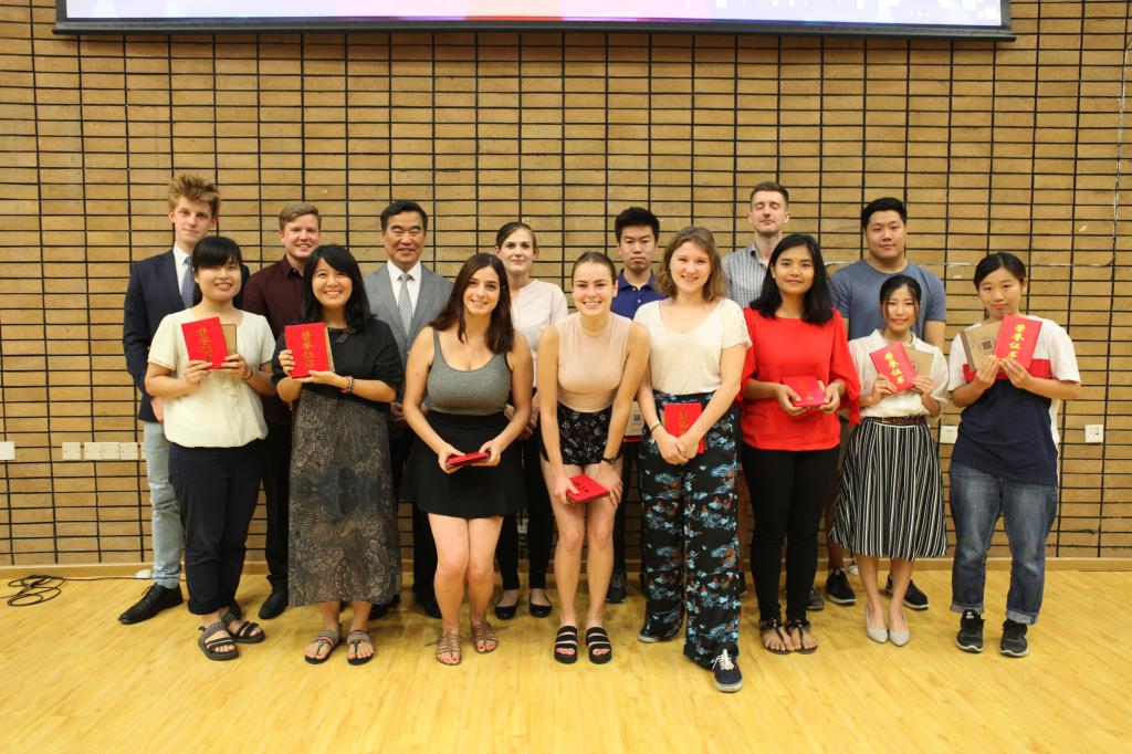 典礼举行了颁奖仪式,分别表彰“优秀学生”、“好班长”和“全勤生”。汉语培训中心进修部魏瑞明同学和他的三位队友参加了“2018年北京外国留学生汉语辩论邀请赛” ,最终bv伟德国际1946代表队突破重围获得总冠军。借此结业典礼的机会,中文学院刘厚广书记为最佳辩手魏明瑞同学颁奖,陈小明副院长为参加“2018在京外国留学生‘我与北京’主题征文比赛”并获得二等奖、三等奖以及优秀奖的学生颁奖。