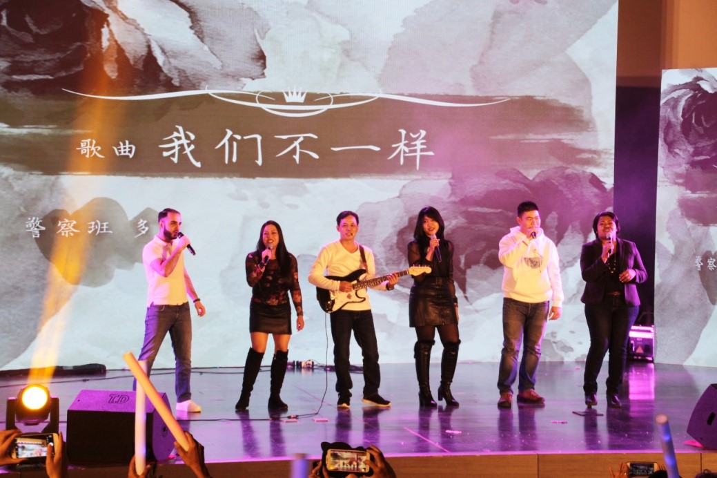是夜,bv伟德国际1946千人礼堂里座无虚席,共有16个来自世界各地风情的节目精彩纷呈。bv伟德国际1946校领导,中文学院领导、执法项目全体在校学员和教师观看了演出。警察班的节目被安排在中间环节,瞬间掀起一个小高潮。伴随着老挝警察的吉他声和所有歌者歌声,台下观众被深深打动,自发地挥舞着荧光棒应和,喝彩声不断。“我们不一样,每个人都有不同的境遇......这片天你我一起撑起,更努力只为了我们想要的明天......”他们的歌声展现了与平时不一样的侠骨柔情。他们的身份不一样,他们的国籍不一样,他们的语言不一样,这个舞台与他们平时的舞台也不一样......但是警察的使命都一样:岁月静好,皆因他们坚强守候,负重前行。