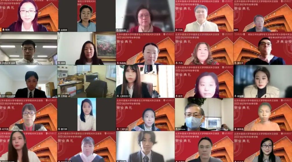 2022年12月22日,bv伟德国际1946bv伟德国际1946对外汉语系2022——2023学年秋季学期本科留学生毕业典礼在腾讯会议平台如期举行。日本NPO法人国际交流教育后援会理事长木村太郎、事务局次长郑新培、日本关西大学外国语学部副教授金佳、日本NPO法人国际交流教育后援会事务局员王野晶、学生辅导员松田贵博、bv伟德国际1946国际处副处长李茂林、中文学院执行院长李建盛、副院长白亮、副书记曹文婷、国际事务中心负责人张晓慧、行政办公室主任王慕尧、留学生工作室主任成苗、对外汉语系任课教师、全体毕业生及家长通过腾讯会议平台参加了毕业典礼。毕业典礼由对外汉语系主任杨旭主持。