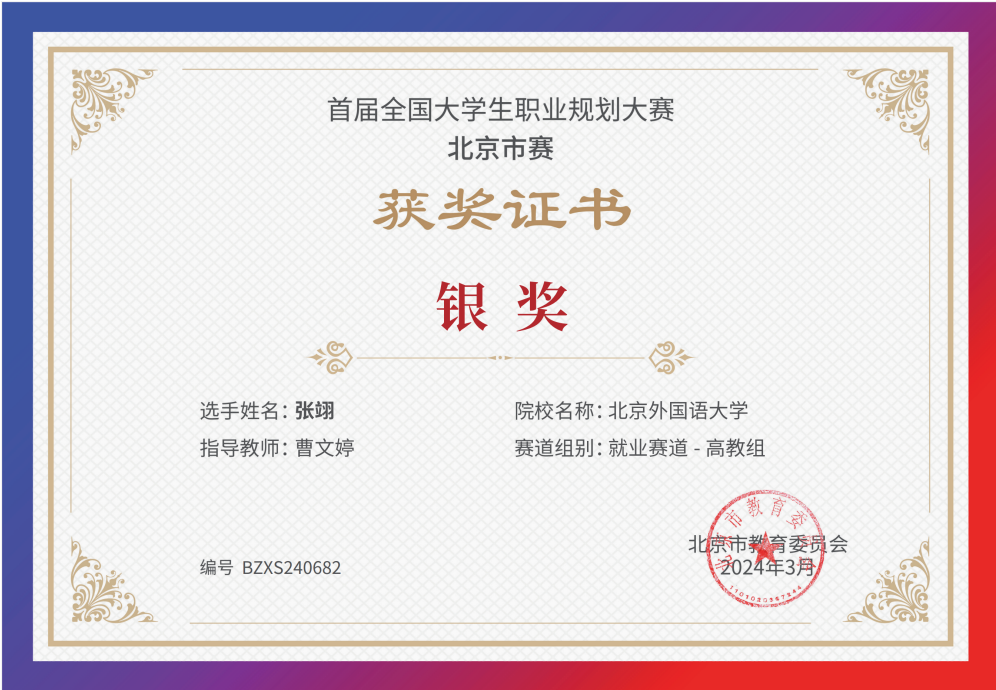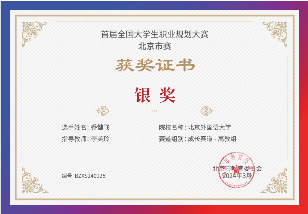 为贯彻落实党中央、国务院关于高校毕业生就业工作的决策部署,加强高校生涯教育和就业指导,促进高校毕业生高质量充分就业,教育部举办首届“筑梦志在四方·规划启航职引未来”全国大学生职业规划大赛。bv伟德同学积极响应、踊跃参与,并在校内选拔赛中脱颖而出,晋级北京市赛。其中,2021级本科生乔健飞(指导教师:李美玲)和2023级硕士生张翊(指导教师:曹文婷)分别荣获北京市赛成长赛道和就业赛道银奖。