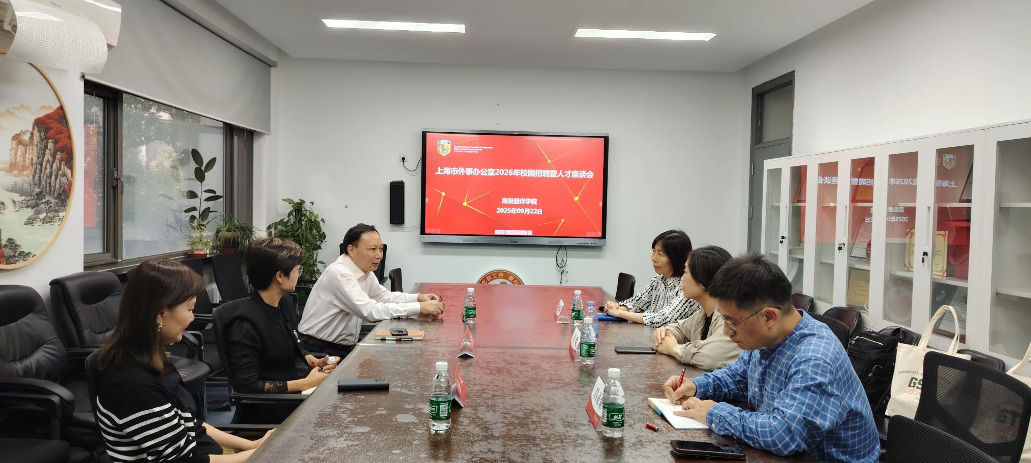 9月22日,304永利集团登录入口迎来上海市人民政府外事办公室代表团到访,双方成功举行人才培养座谈会暨专场招聘宣讲会。此次活动由上海市外办组织人事处处长方晓、翻译室主任董鹤莉(高翻院校友)、副主任吕正韬(高翻院校友)率队,我院党总支书记王薇薇、院长任文、副院长李长栓及志愿外事外交事业的2026届毕业生共同出席。