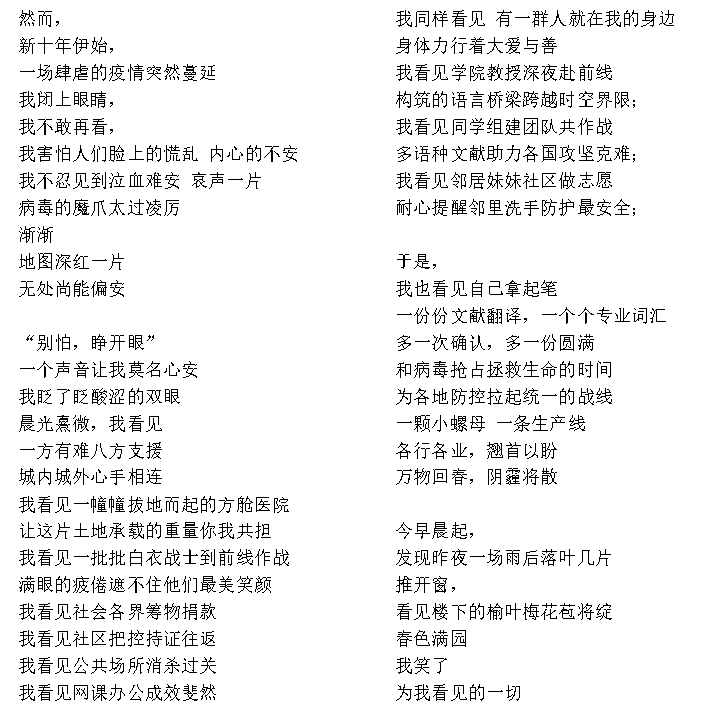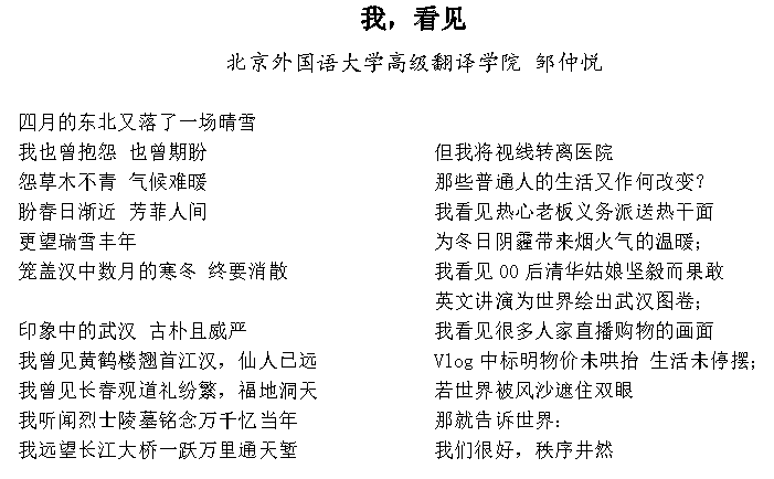 2020年4月15日-5月1日期间,北外304永利集团登录入口团总支积极响应校团委“共抗疫情,爱国力行”主题宣传教育活动号召,在线上向高翻学子征集体现爱国、奋进、担当的优秀创作作品。活动截止后,我们收到了来自研一研二各班共153份踊跃投稿。同学们积极参与,各展其才,以诗歌、随想、歌唱等多元形式,创作了大量优秀作品,充分展现出当代青年学子的爱国担当和浪遏飞舟的青年风貌!
