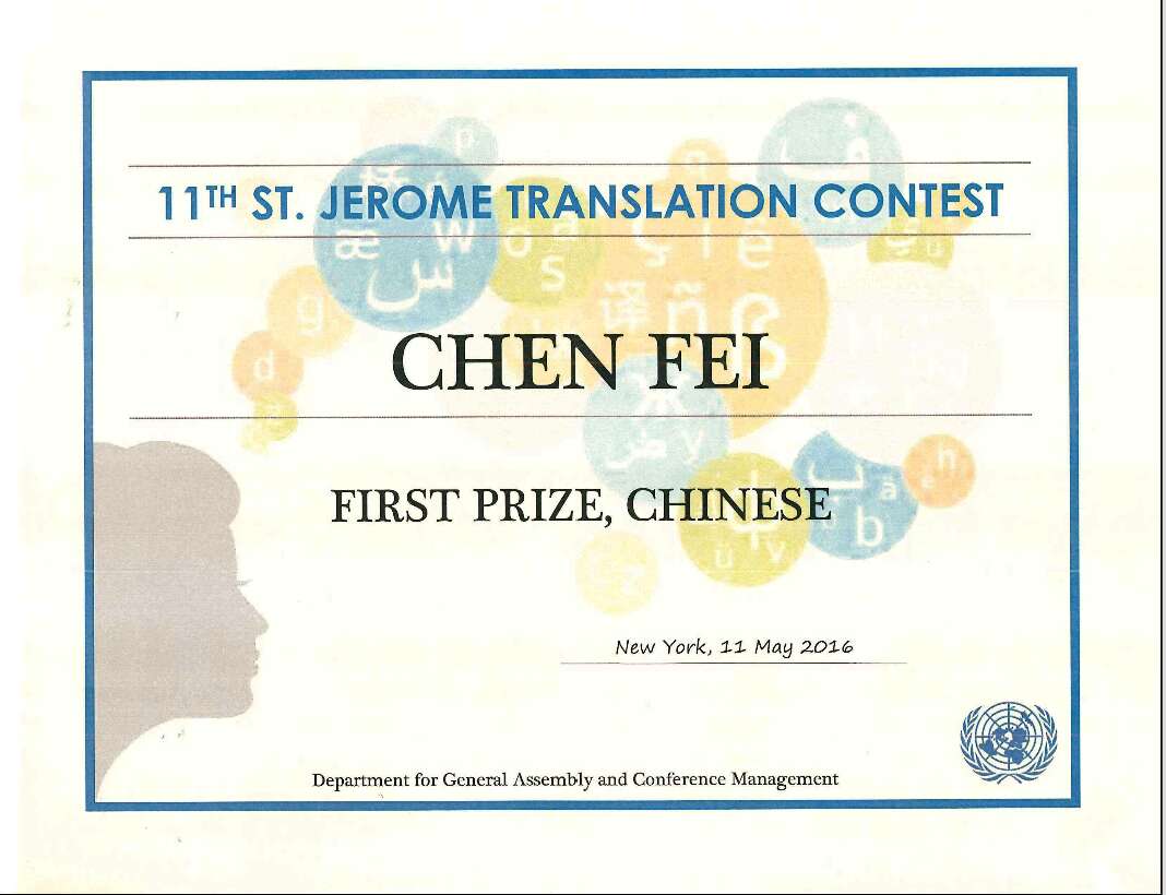 2016年5月11日,第十一届圣杰罗姆翻译年赛(Eleventh Annual St. Jerome Translation Contest, 2015)颁奖仪式在纽约联合国总部举行。304永利集团登录入口2014届学生费晨荣获一等奖。