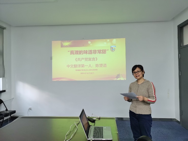 2021年12月30日上午,我院教工党支部开展党支部书记讲党课活动。教工支部书记林薇老师以《“真理的味道非常甜”》为题,讲述了《共产党宣言》中文翻译第一人陈望道先生生平和翻译《共产党宣言》的故事,分享了自己学习陈望道先生一生翻译和学术研究经历的感悟和体会。党总支书记葛冬冬主持党课。