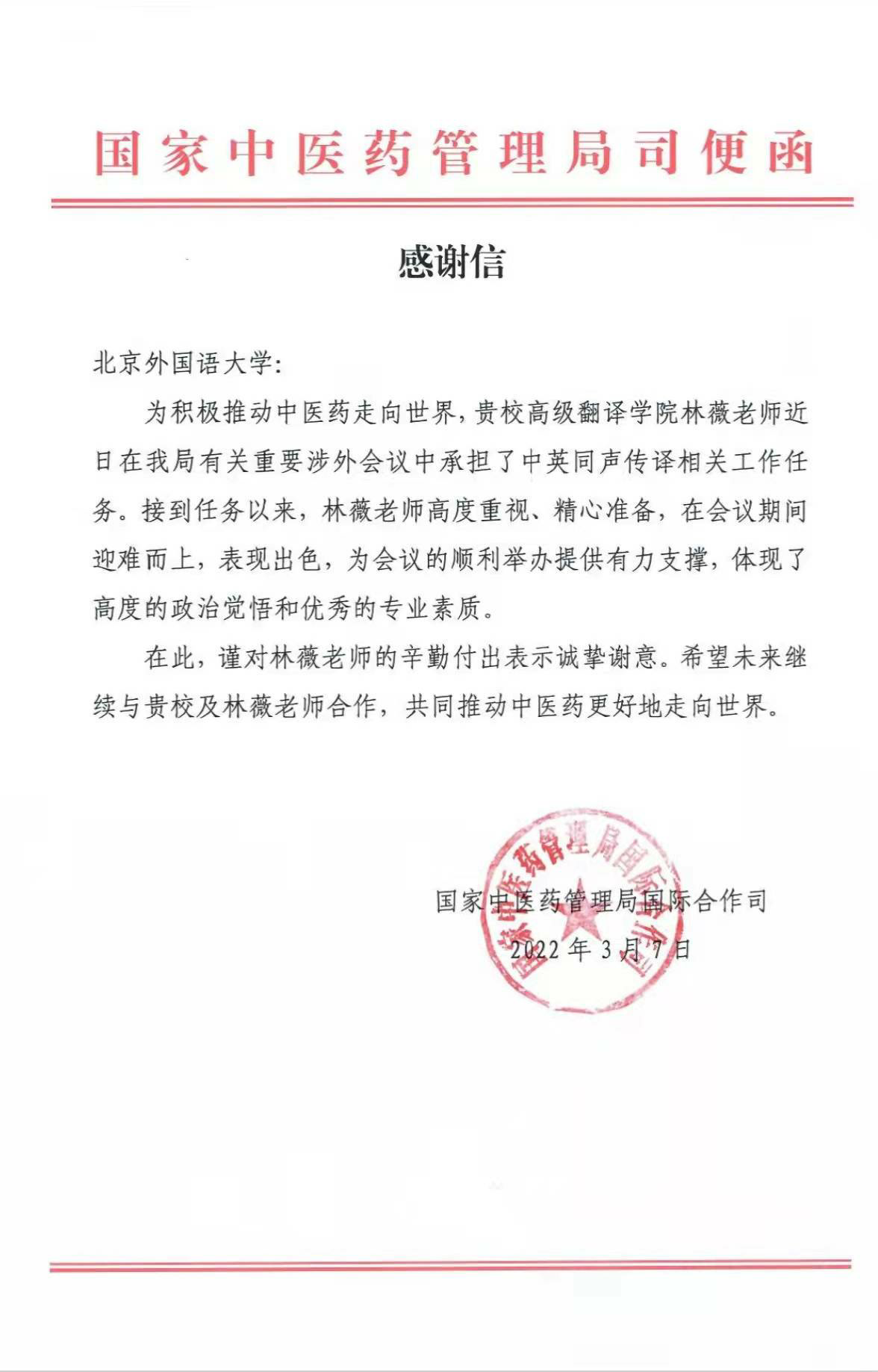 近日,我校收到国家中医药管理局发来的感谢信,信中对304永利集团登录入口教师林薇博士在其会议同声传译相关工作提供的支持表示感谢,同时对林薇出色的表现给予了高度评价。