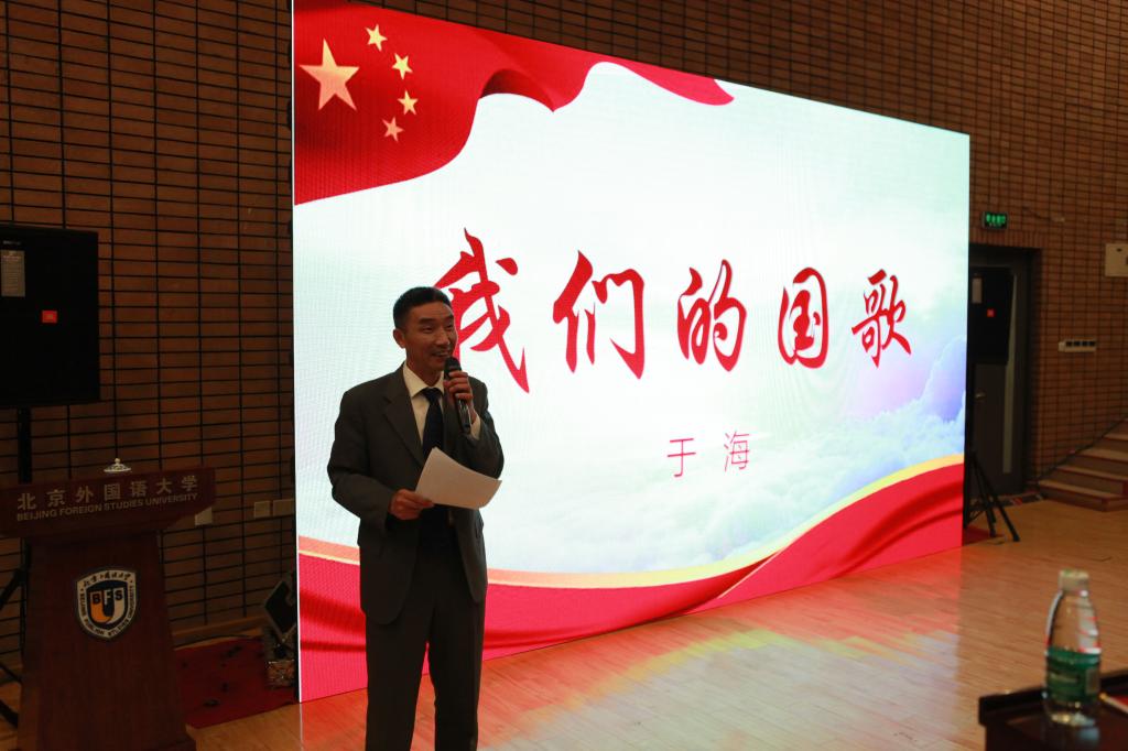 刘厚广主持活动时说,北外诞生于抗日战争的烽火,成长在解放战争的熔炉,快速发展在改革开放时期,目前正腾飞在伟大新时代。历代北外人,秉持“兼容并蓄,博学笃行”的精神品质,传承《人民需要我们到哪里我们就到哪里》的豪情壮志与使命担当,爱国报国的红色基因在北外生生不息、代代相传。着眼当下,我们正在深入学习贯彻习近平新时代中国特色社会主义思想,厚植爱国主义情怀,推动美育教育,实施新一轮的教育教学改革,造就德智体美劳全面发展的、既具有世界眼光、更具有中国情怀的、高水平、国际化人才,正朝着世界一流外国语大学的目标迈进。于海老师同样也怀着美好愿望和殷切期待,激励北外师生为国旗增光添彩,体会国歌饱含的民族情感和催人奋进的坚定意志。一堂精彩的音乐课、历史课、爱国课,让我们领略了于海老师精彩的艺术人生。