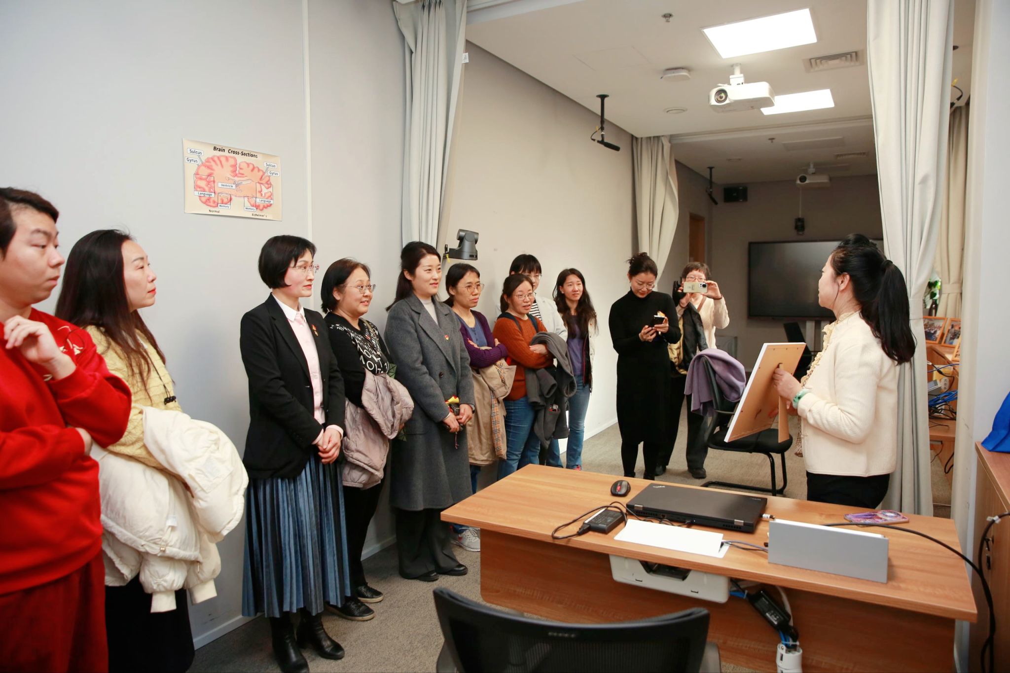 刘红艳教授带领师生参观了眼动及语言行为、生命历程与记忆智能等实验室,并结合自身研究详细介绍了实验室有关阿尔兹海默症的智能诊断系统、基于大数据语言学分析平台以及语言治疗的研究现状等。相关研究极具前沿性和应用价值,赢得了师生的赞叹。