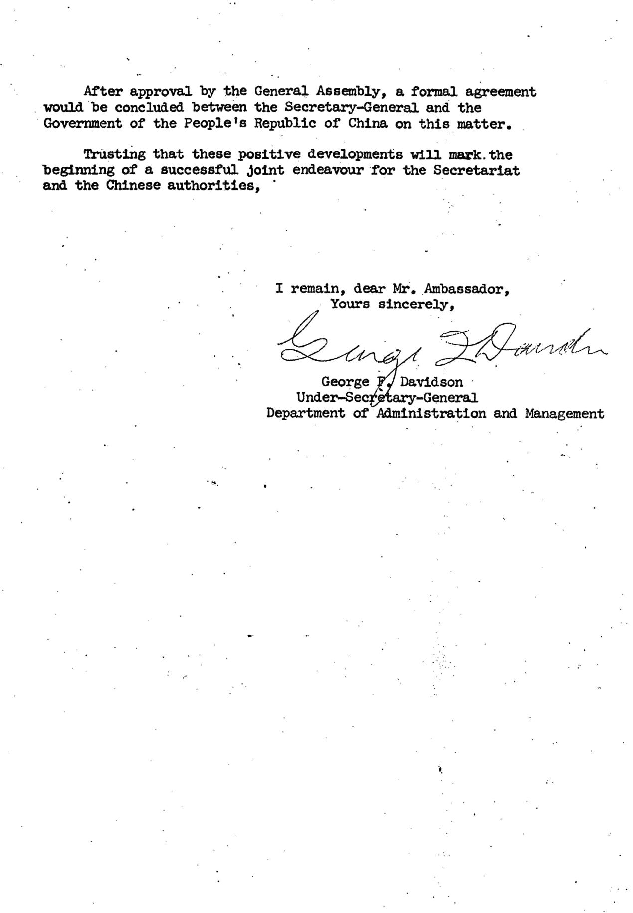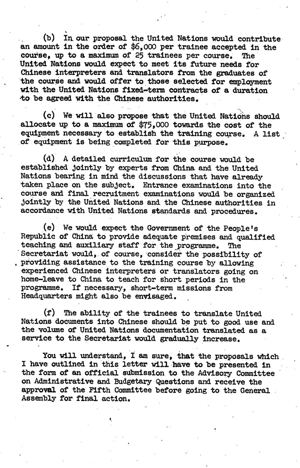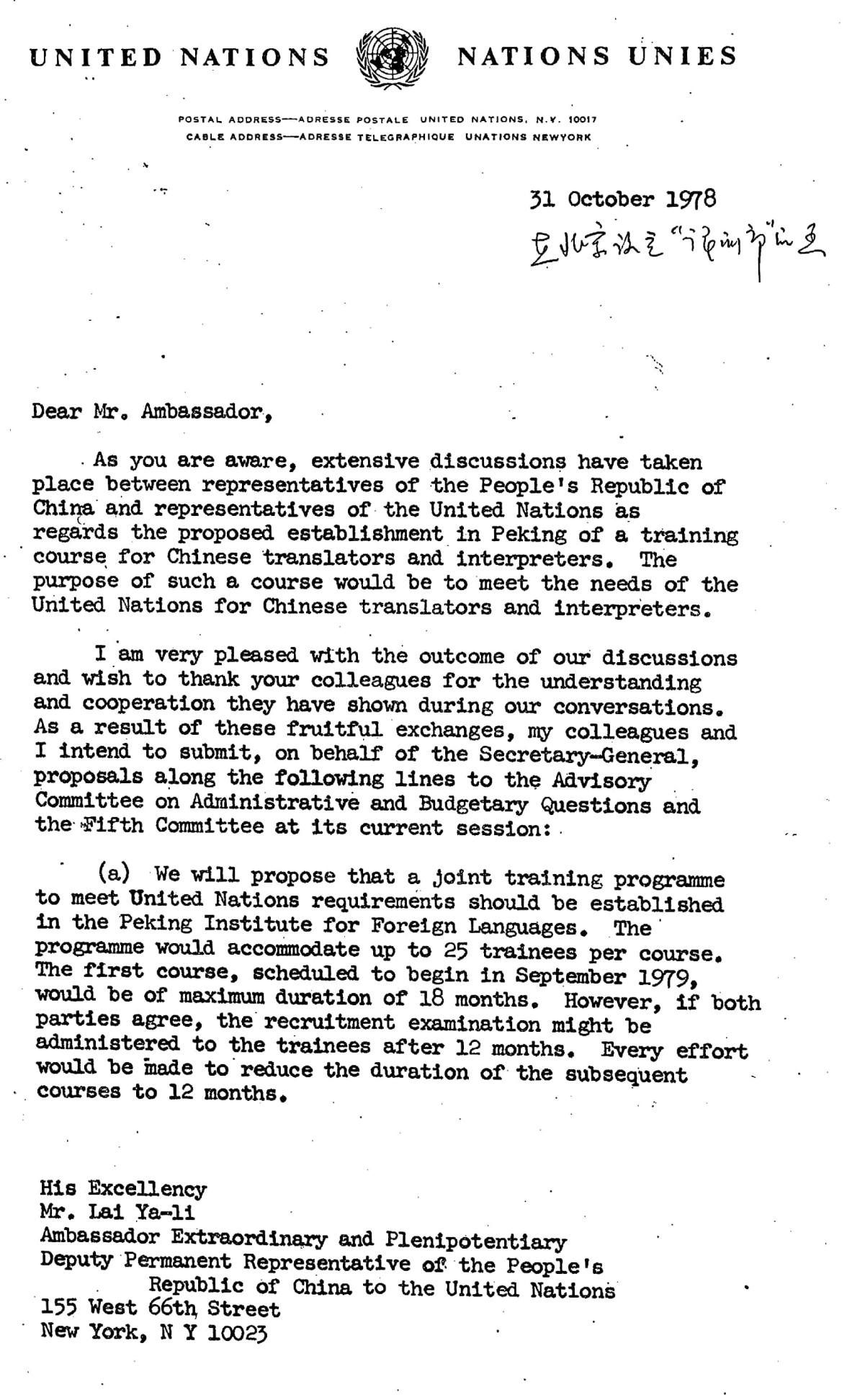 联合国关于在北京外国语学院设立联合国译员训练班的函